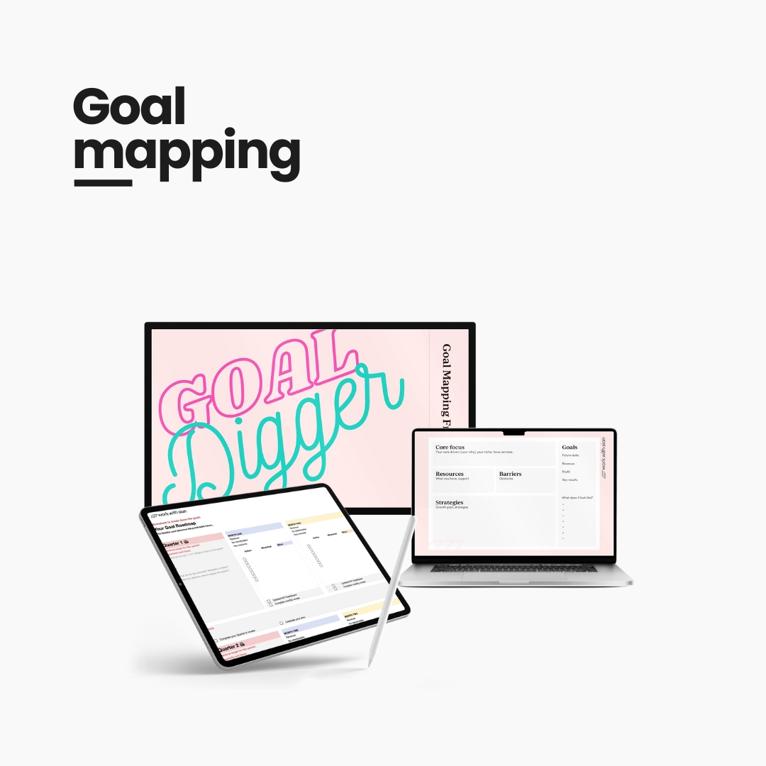 Goal mapping tool to set goals, map them and turn them into a roadmap to actually achieve them. Includes goal map and roadmap template.